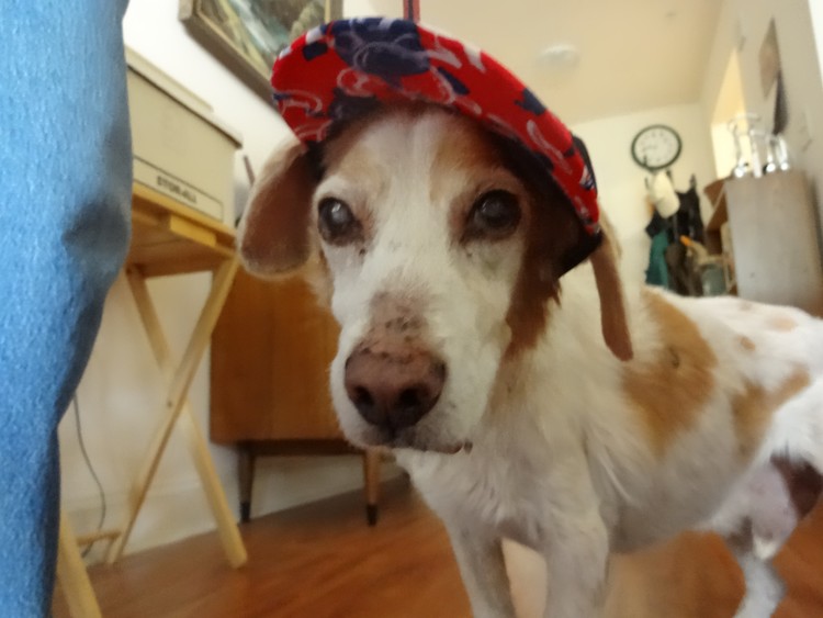 My compassionate vet spent 45 minutes with us. She examined Korku carefully, then asked me many questions about how he behaves. In the end, she assured me that he’s not in pain. He’s slow on his feet not because of arthritis but because of weakened leg muscles. And if he stands around at times, looking lost, it’s probably because he is lost. The cataracts limit his vision and he can’t see his surroundings clearly, especially when the sun is in his eyes. To help with that, I’ve bought him a sun visor.