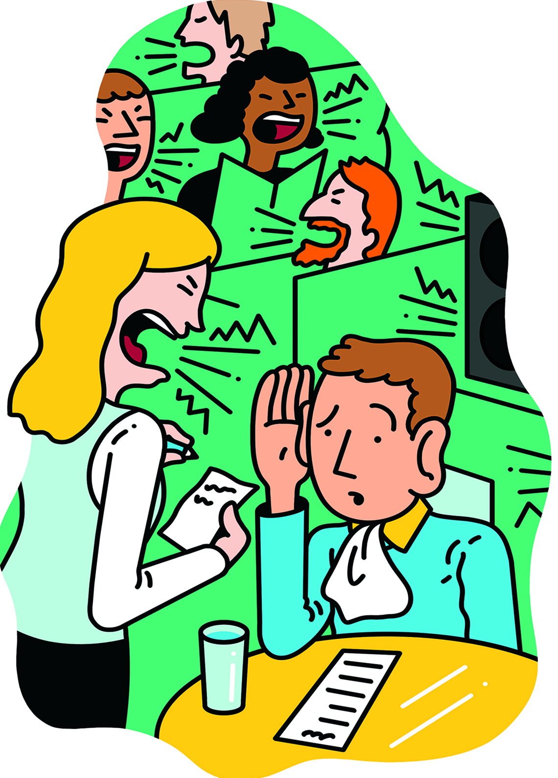 It doesn’t look as if there will be a change for the quieter any time soon. But if you dislike restaurant noise as much as I do, there are things you can try—besides learning sign language. Julia Belluz, senior health correspondent for the news and opinion website Vox.com, offered a few suggestions: dine early, before the dinner rush begins; request a quiet table; ask for the music to be turned down. If none of that helps, lodge a complaint with the management.